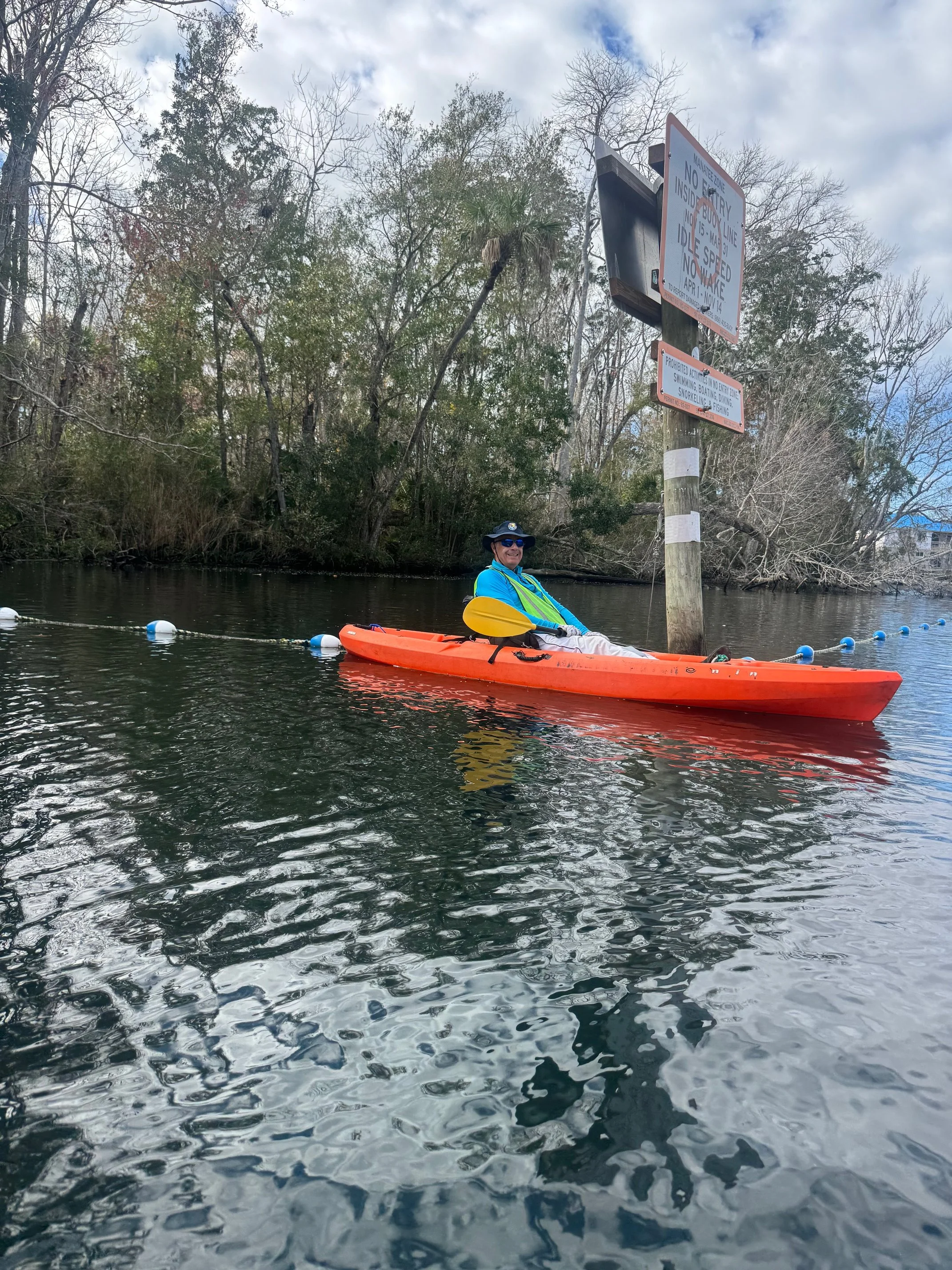 Each time I visited the springs that week, I noticed people paddling quietly through the water wearing official-looking vests. At first, I assumed they were there primarily to enforce the rules about interacting with the manatees — which are important and strictly followed here.
